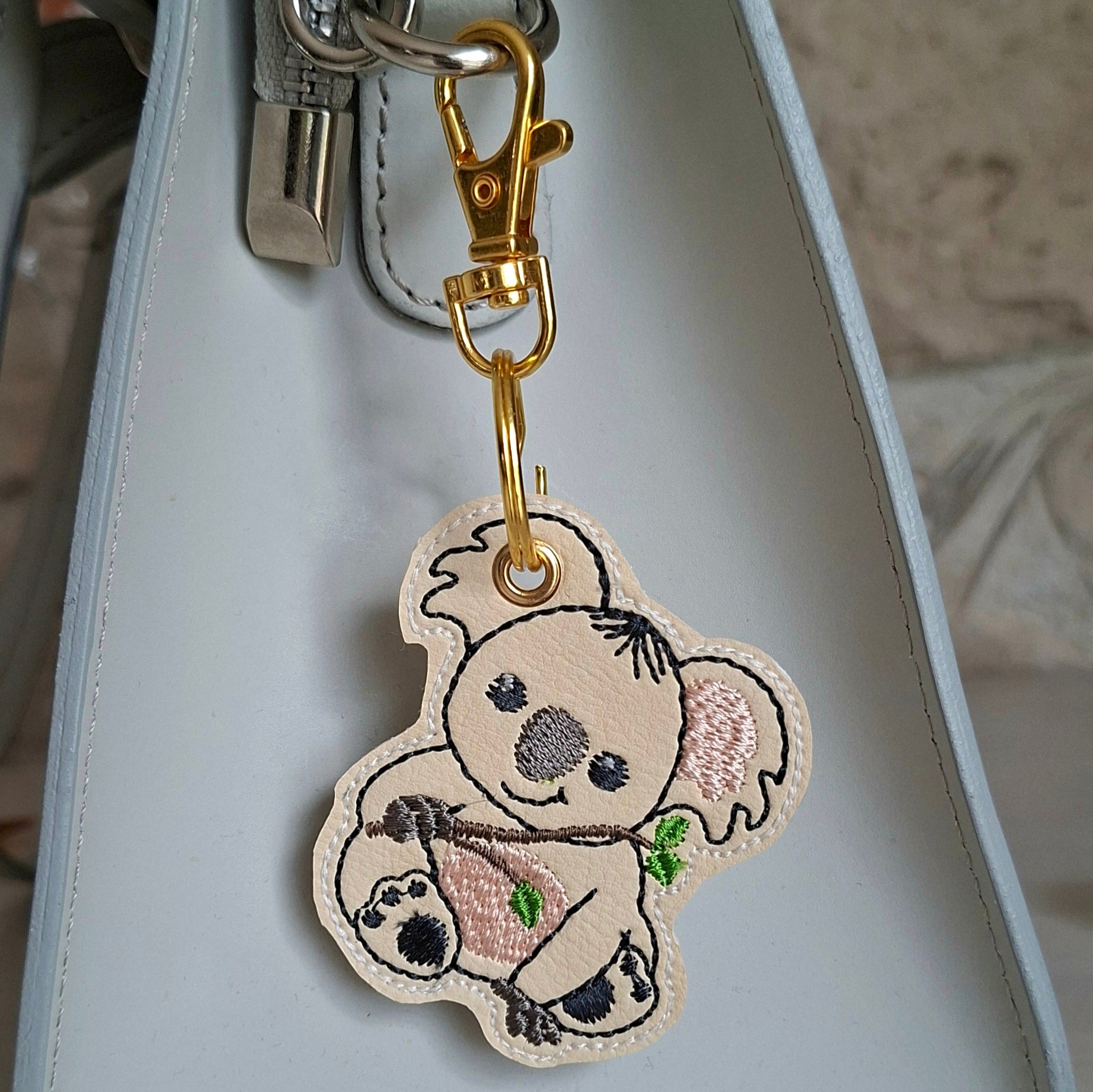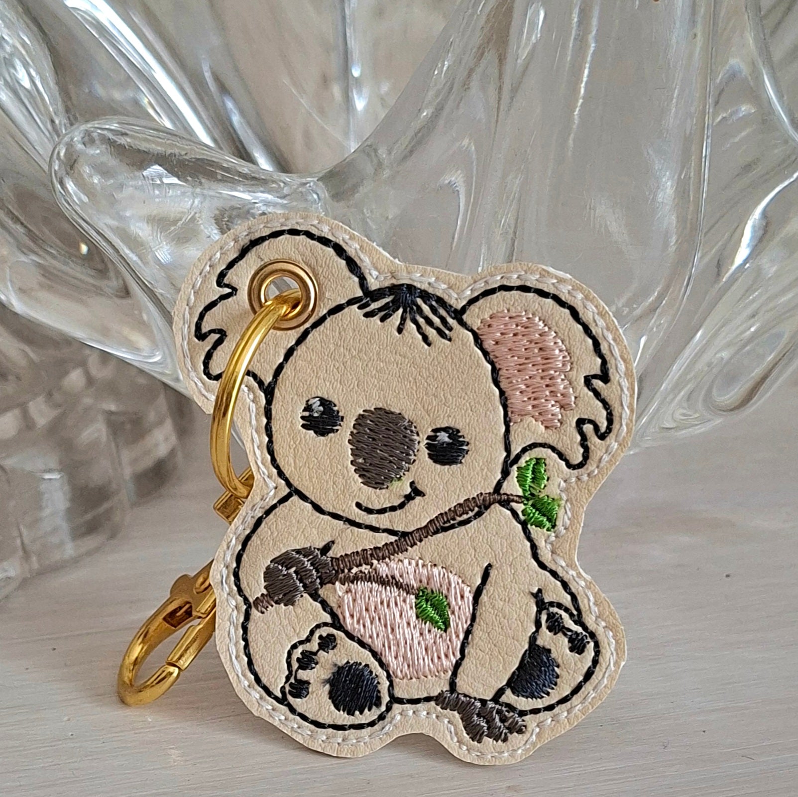 Ce porte-clés koala brodé est réalisé sur simili-cuir, dans une harmonie de teintes douces et naturelles. Je réalise ensuite la broderie, l’assemblage et les finitions dans mon atelier, pour donner naissance à un petit accessoire textile soigné et plein de douceur.