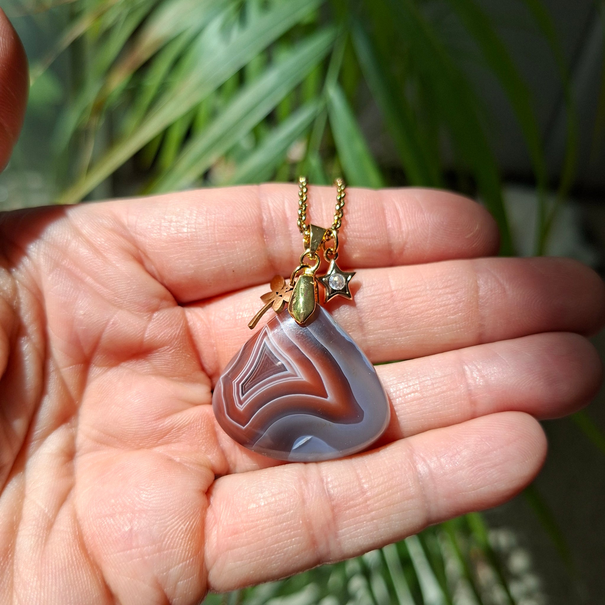 J’ai choisi cette agate du Botswana pour la finesse de ses dessins naturels et ses nuances douces. Sa forme triangulaire lui donne une présence particulière, tandis que la libellule et l’étoile apportent une touche délicate.