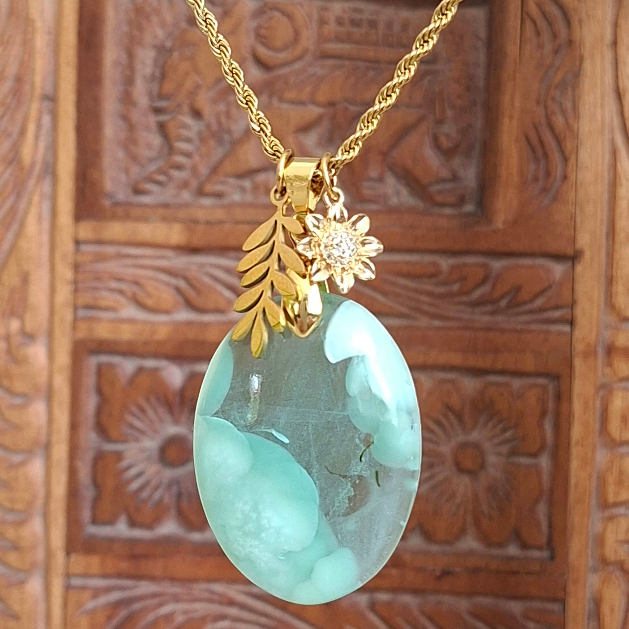 Collier en hémimorphite ovale, pierre montée sur une chaîne maille torsadée en acier inoxydable doré avec breloques feuille et fleur.