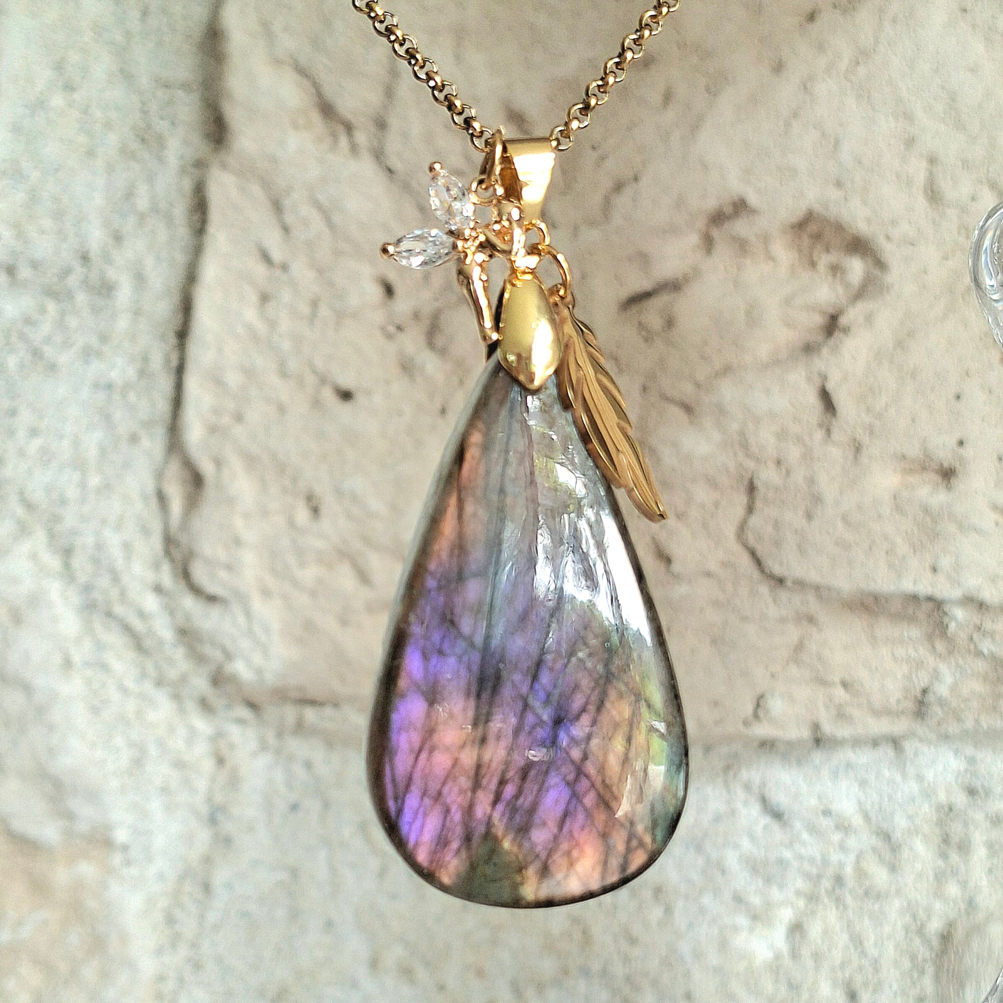 Collier en labradorite naturelle en forme de goutte, pierre montée sur une chaîne maille bambou en acier inoxydable doré, avec breloques plume et fée aux ailes en zirconium.