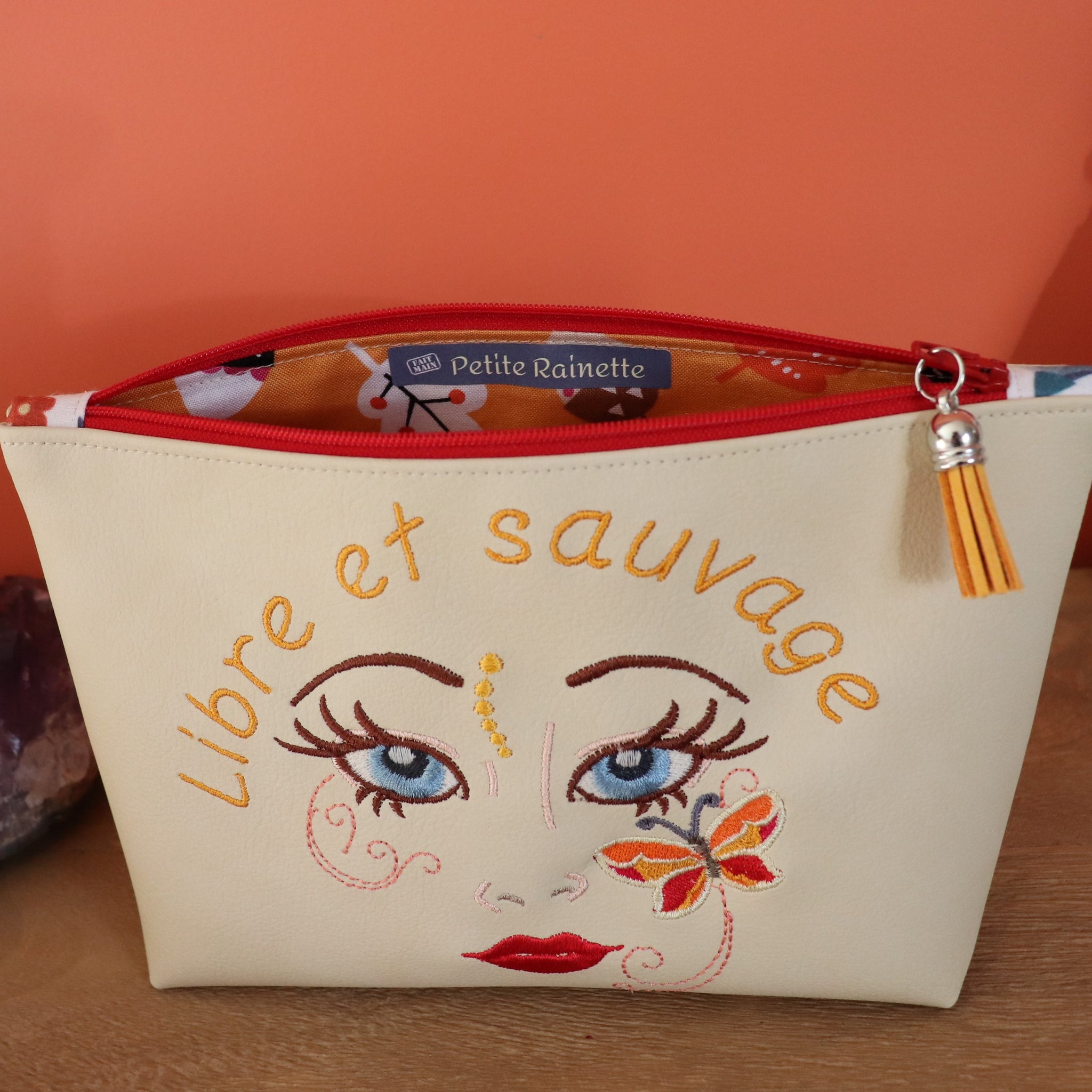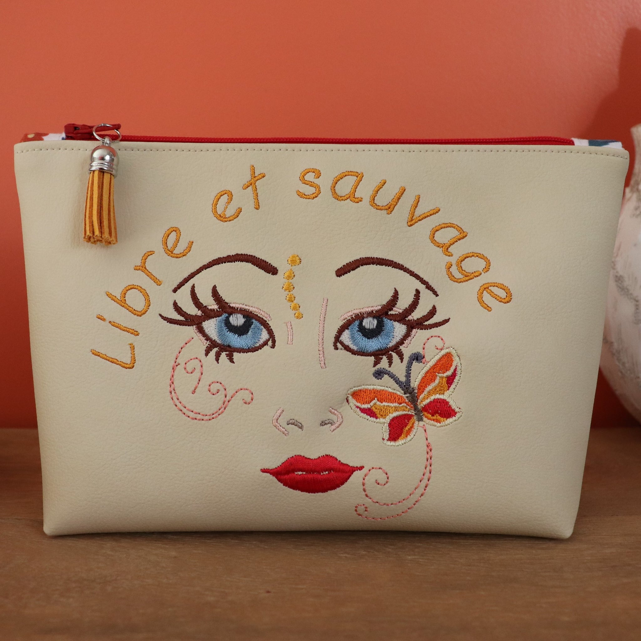 Trousse femme en simili cuir brodée avec visage féminin et l'inscription "libre et sauvage", prête à offrir ou à s'offrir.