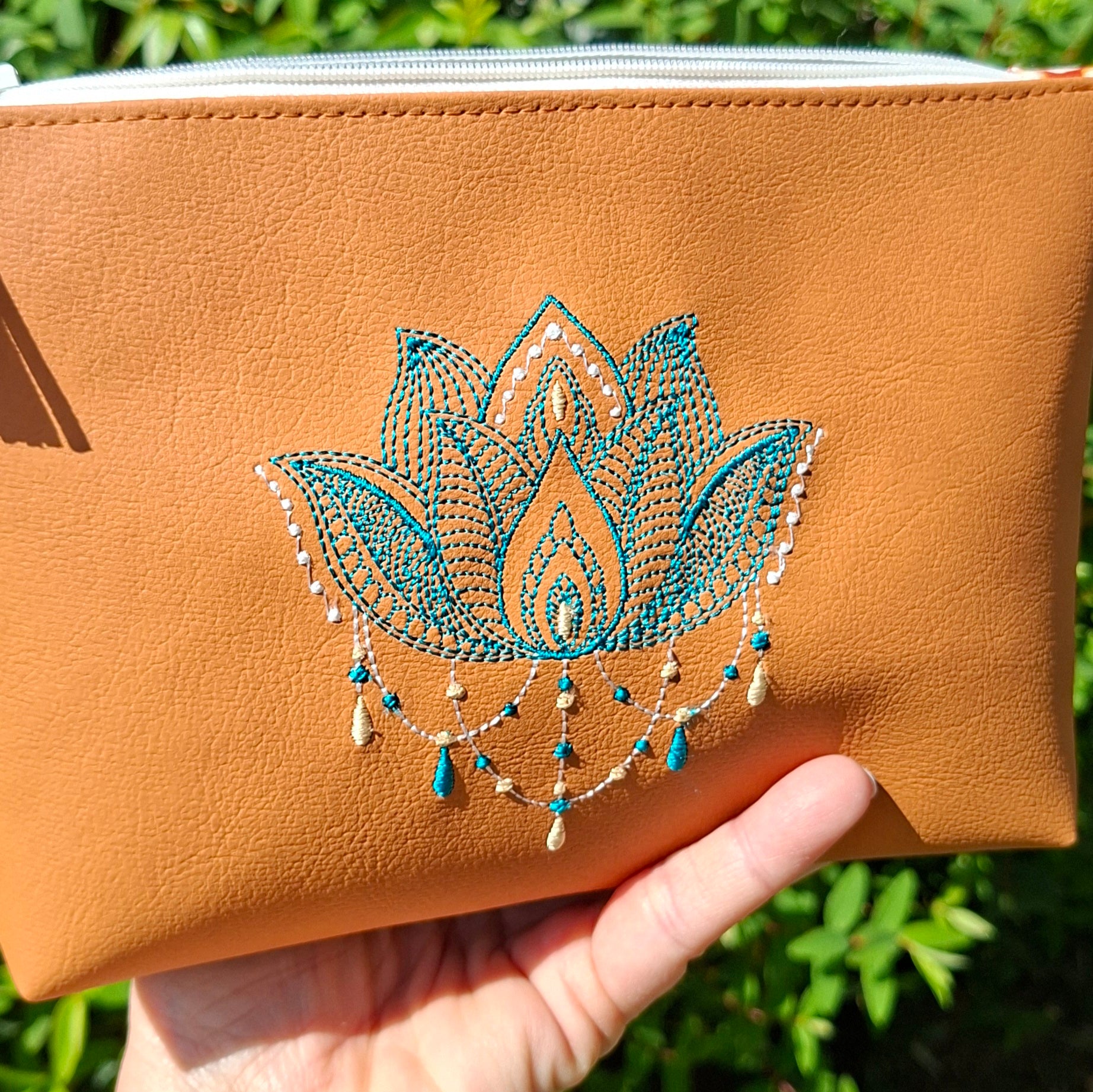 Trousse femme brodée motif lotus en simili cuir camel, accessoire du quotidien à la fois pratique et esthétique, prête à offrir ou à s'offrir.