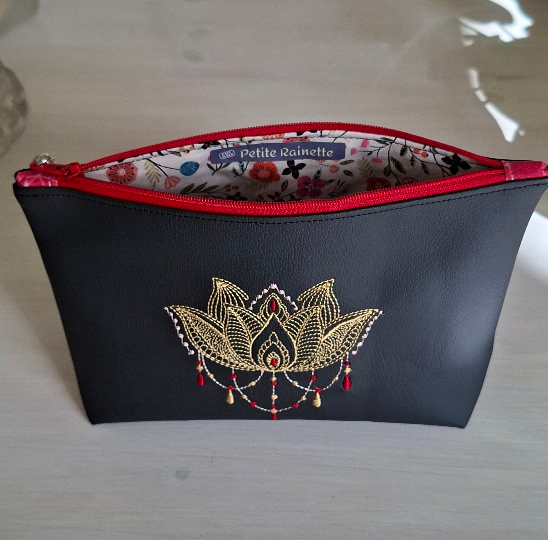 Trousse femme brodée motif lotus en simili cuir noir, accessoire du quotidien au contraste marqué, à la fois pratique et élégant, prête à offrir ou à s'offrir.