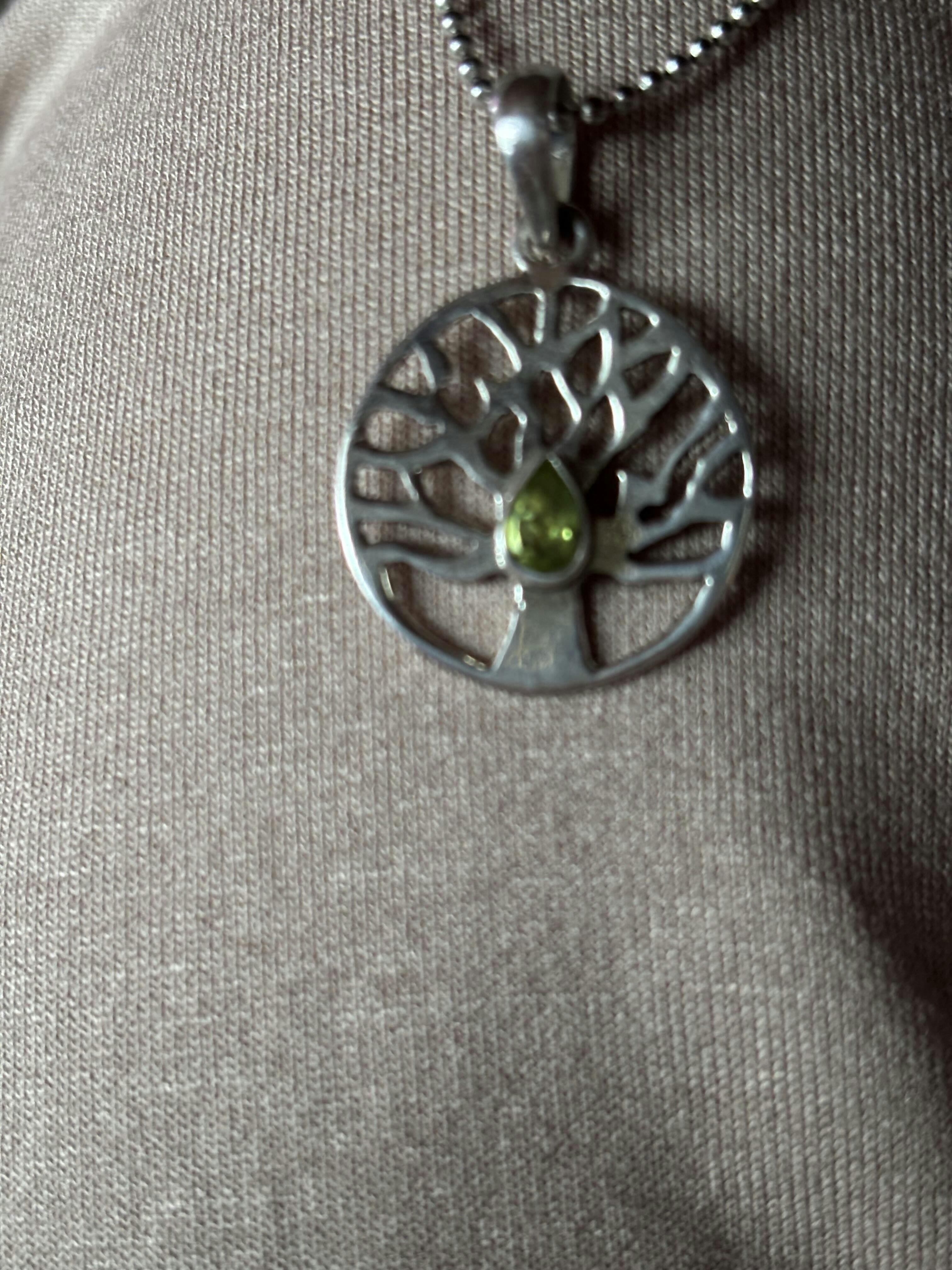 Pendentif arbre de vie en argent et péridot facetté taillé en forme de poire.